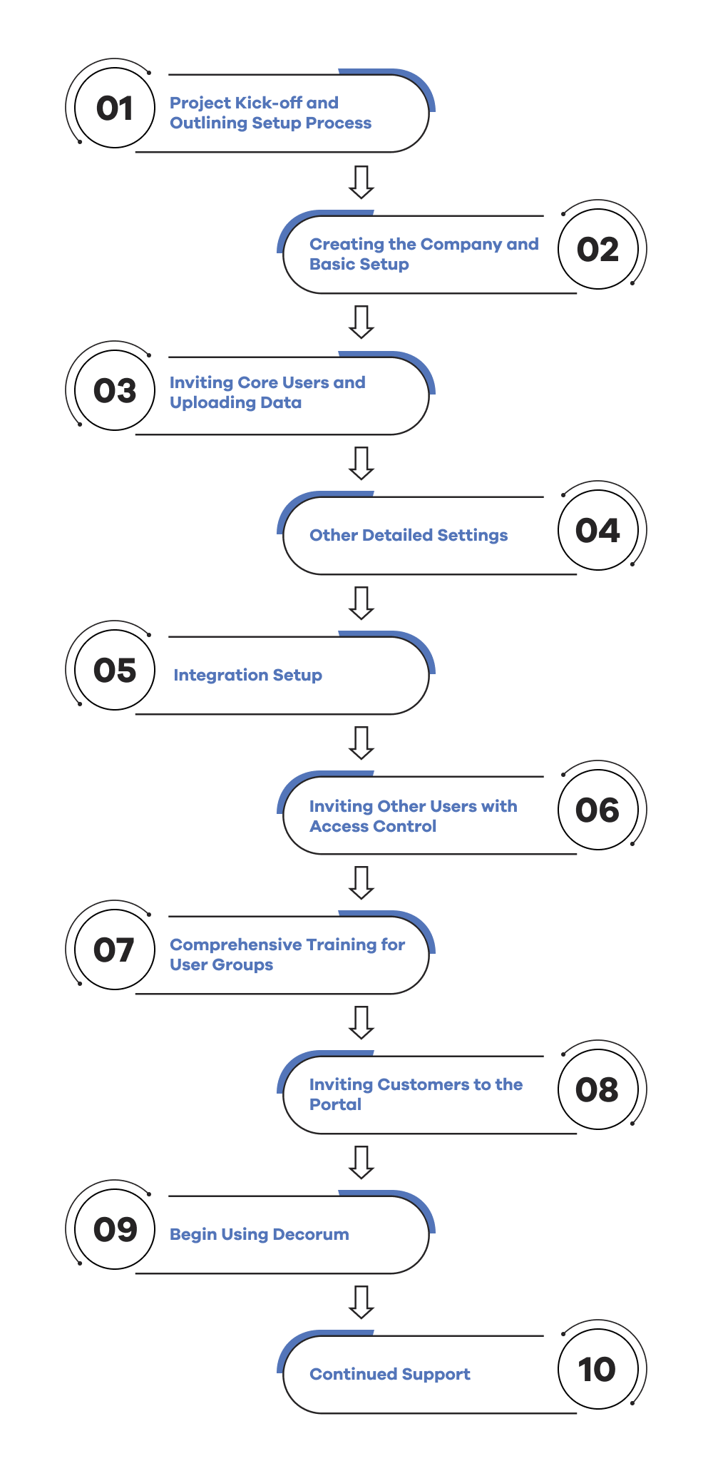 The implementation process begins with a project kick-off where we work closely with your team to outline the setup requirements for Decorum, our order management software.